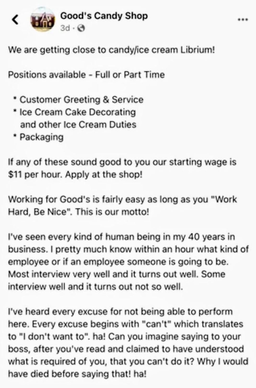 Randy Good—a candy store owner in Anderson, Indiana wrote a Facebook post that left many readers feeling uncomfortable and wondering if it was a job posting or a diatribe against women.