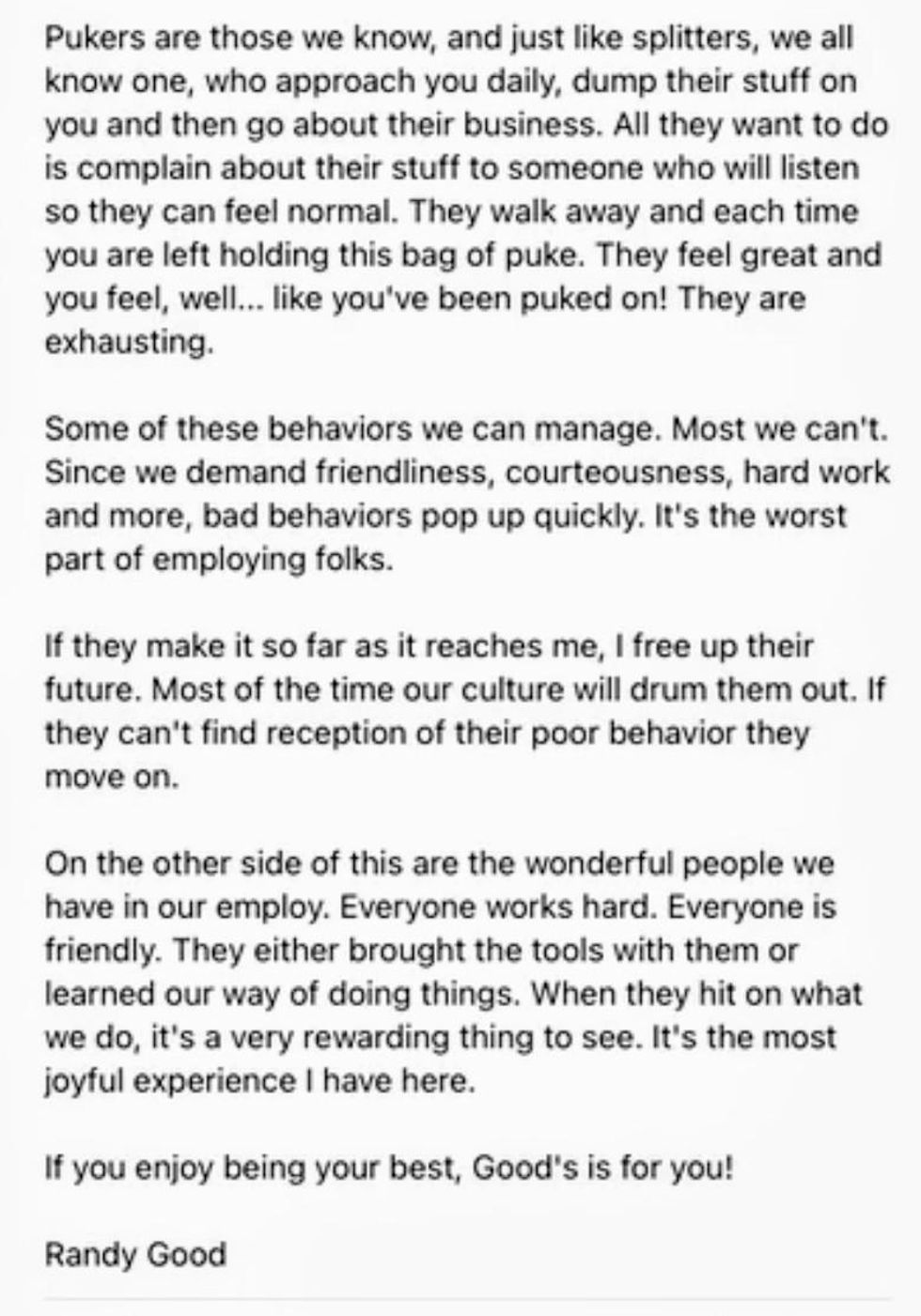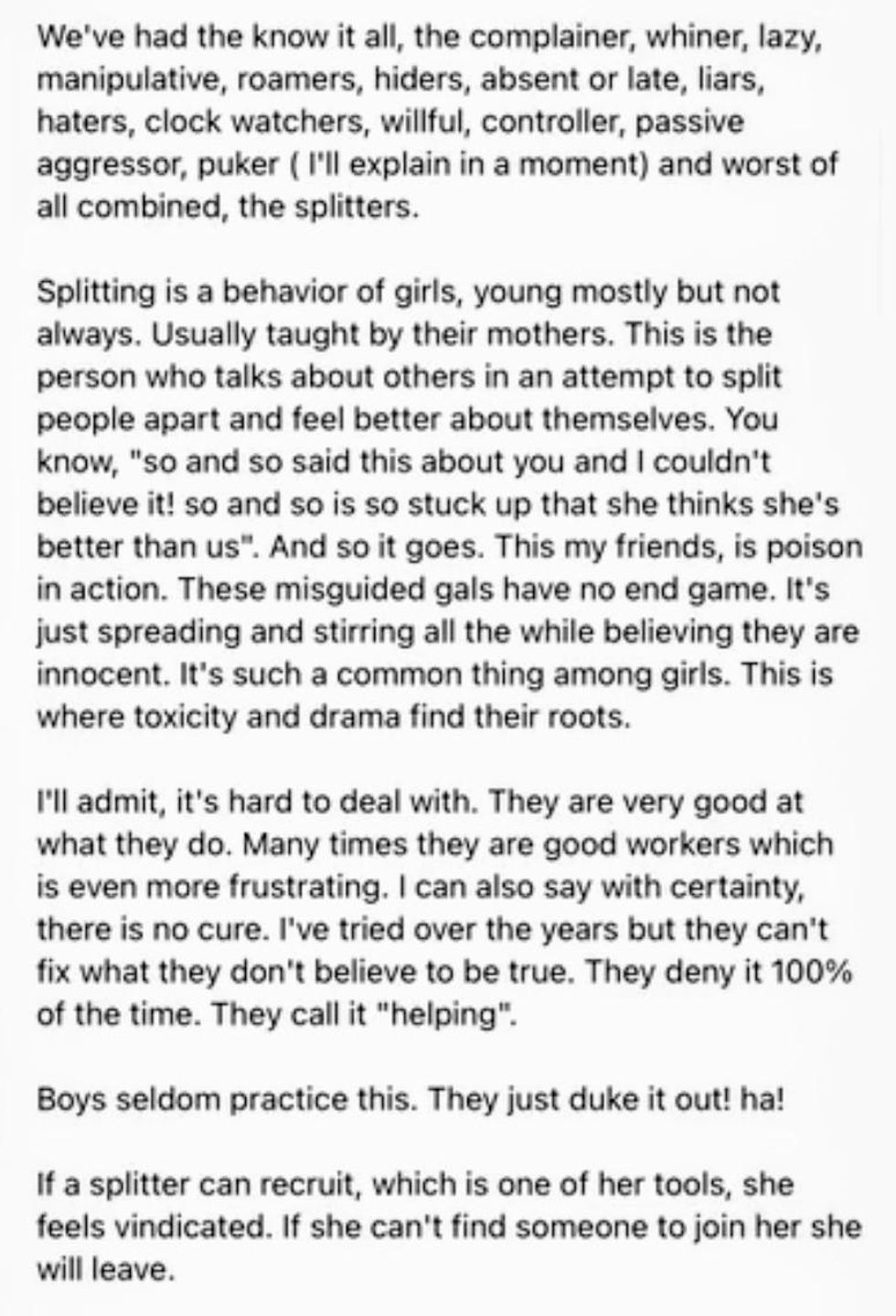 "We've had the know it all, the complainer, whiner, lazy, manipulative, roamers, hiders, absent or late, liars, haters, clock watchers, willful, controller, passive aggressor, puker ( I'll explain in a moment) and worst of all combined, the splitters."