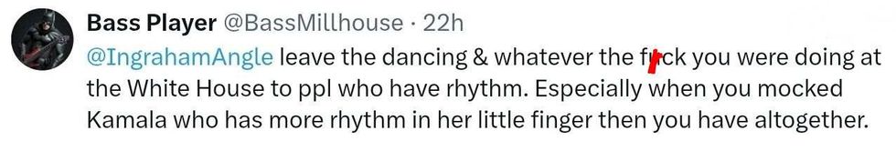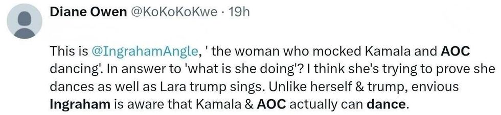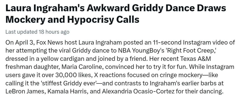 "While Instagram users gave it over 30,000 likes, X reactions focused on cringe mockery—like calling it the 'stiffest Griddy ever'—and contrasts to Ingraham's earlier barbs at LeBron James, Kamala Harris, and Alexandria Ocasio-Cortez for their dancing."