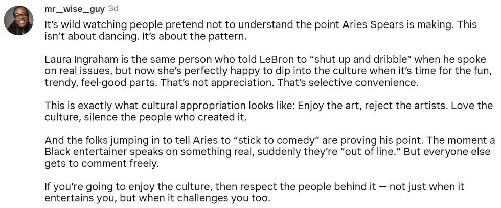 "It’s wild watching people pretend not to understand the point Aries Spears is making. This isn’t about dancing. It’s about the pattern."