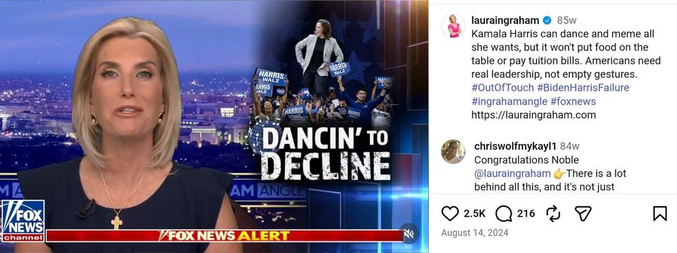 In August of 2024 during the presidential campaign, Ingraham criticized then Democratic candidate and Vice President Kamala Harris for dancing during a segment of Ingraham Angle.