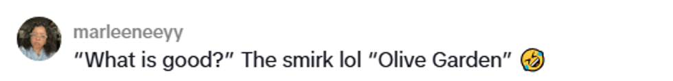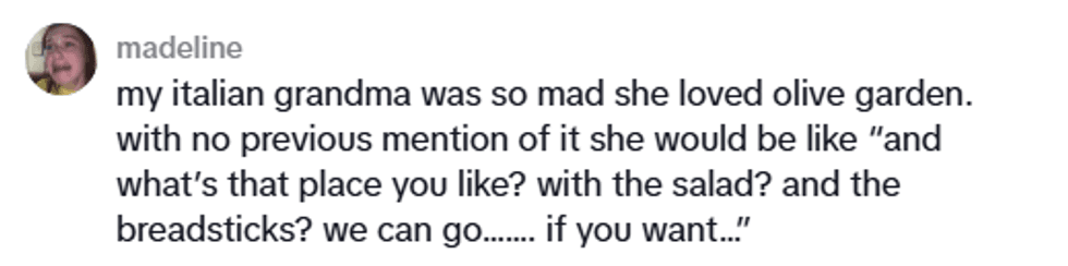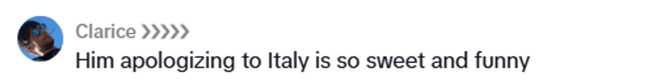 In the first video, TikToker Rhonda, Alessandro's host mom, had to convince the Italian teen to even get out of the car, let alone walk into the restaurant. Along the way, he pointed out that he was certain that no Italians were working at the restaurant, and that the most Italian thing about it was the fact that it was called an "Italian Kitchen."