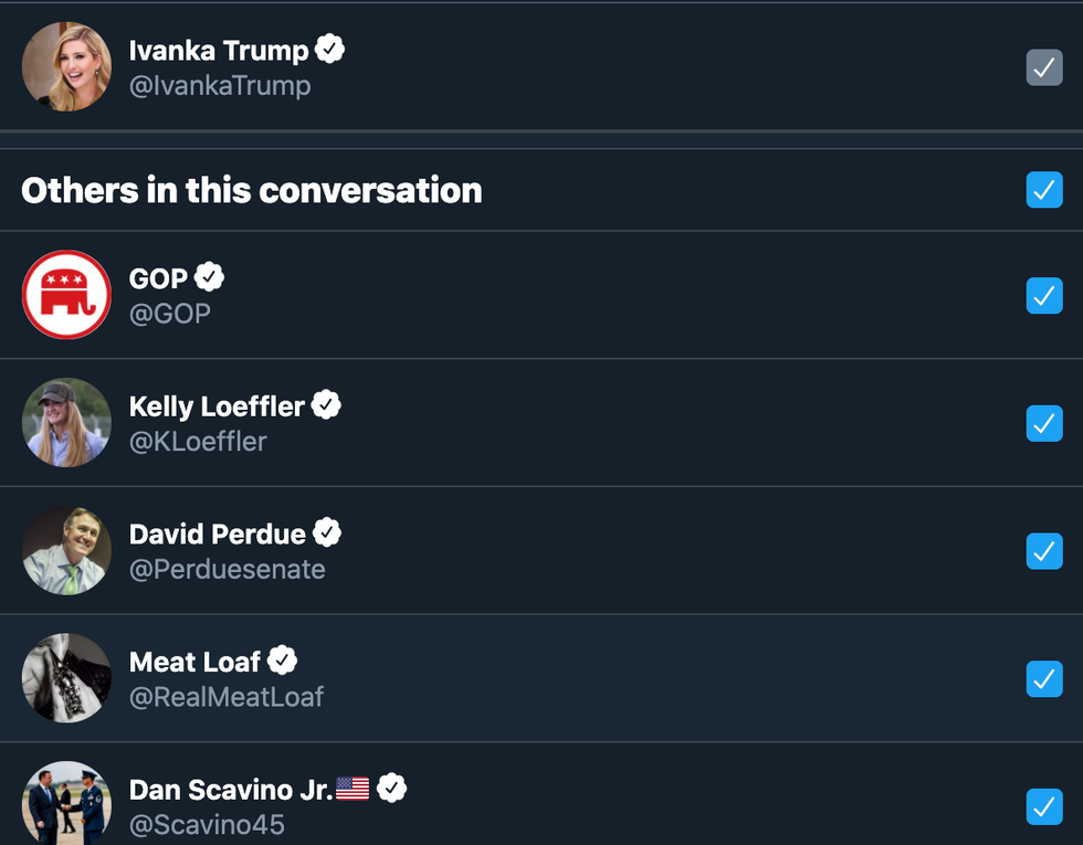 While it's no surprise that Ivanka Trump tagged the GOP, Senators Loeffler and Perdue, and White House Deputy Chief of Staff Dan Scavino, people were confused to see the musician Meat Loaf—of "I'd Do Anything for Love" fame—tagged alongside them.