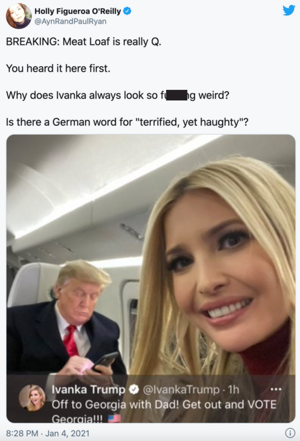 One assumes Ivanka Trump did not mean to tag Grammy winning musical artist Meat Loaf in the selfie she took with the President aboard AF1, en route to tonight's rally in GA, but at this point in the cycle a surprise Meat Loaf appearance wouldn't even be *today's* weirdest thing. pic.twitter.com/qQa4AtouLa