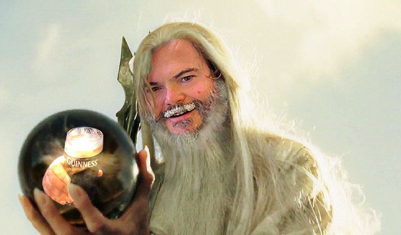 The photo shows Jack with Guinness Beer foam in his beard, with an out of focus and swirly background.