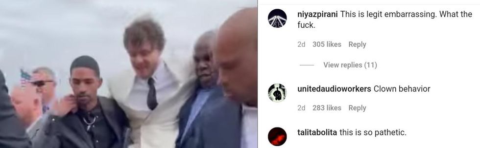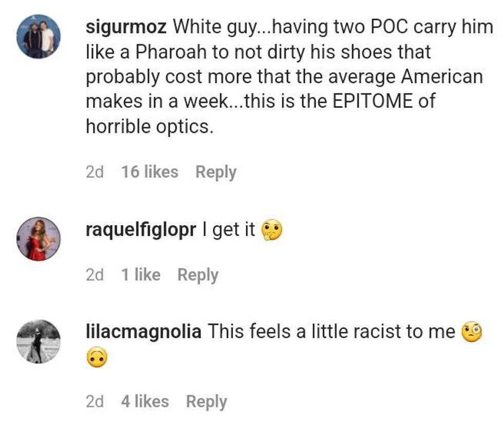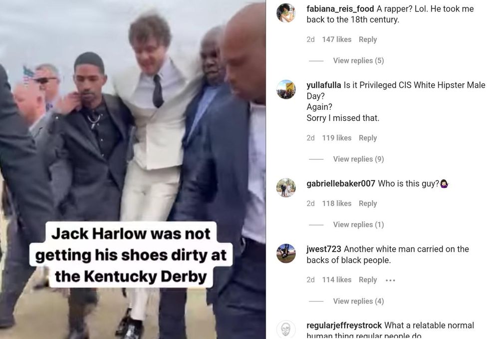 But the outfit was quickly overshadowed by the efforts to maintain those shoes' cleanliness. A video showing a group of Black men carrying Harlow over the venue's dirt to keep his shoes clean left many people uncomfortable over its very awkward optics.
