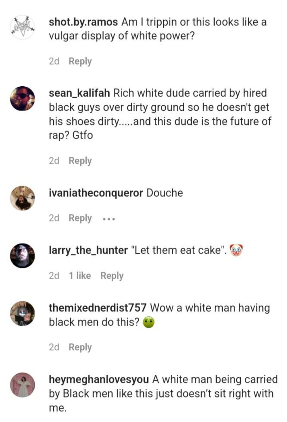 Roll it all together and the video of a rich, privileged White rapper being carried over the mud by a retinue of Black employees at a Southern event with a history of racist oppression being shared by that venue's official social media accounts conjured up some truly uncomfortable and retrograde images for many people.