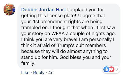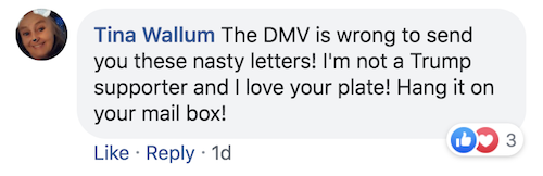 Despite the apparent complaint and revocation by the Texas DMV, Balkenbush saw plenty of support on his Facebook post.