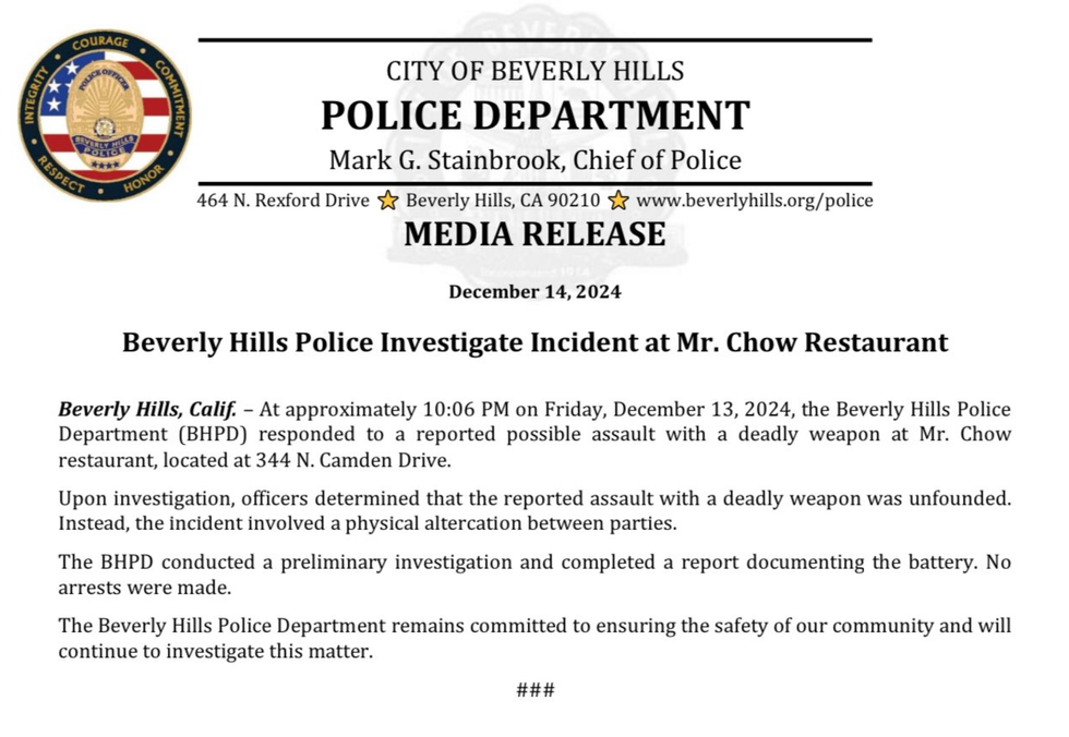 On Friday night, the Beverly Hills Police Department responded to a report of an "assault with a deadly weapon " at Mr. Chow, a posh restaurant located on the 300 block of Camden Drive.