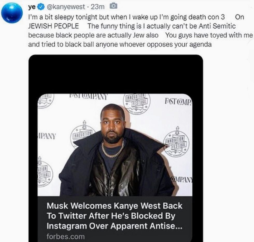 The now deleted tweet that earned Ye a Twitter suspension can be seen here: