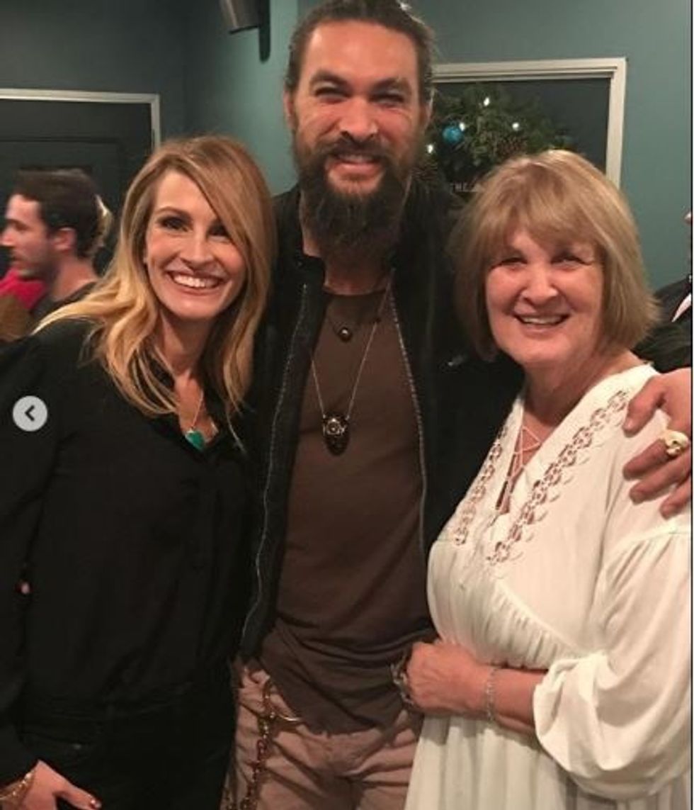 It was all professional while shooting with fellow actor Yahya Abdul-Mateen II, but behind the scenes Momoa and his mom admitted to "geeking out" over meeting Roberts.