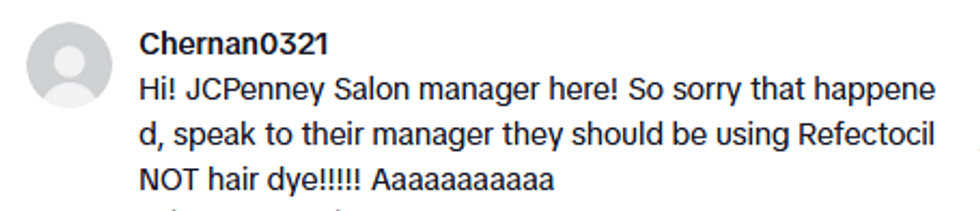 TikToker @fake_chloe_mooney realized she made a mistake going to a JCPenney Salon to get her eyebrows waxed and tinted when the stylist she worked with not only did not put protective gloves on, but then proceeded to put permanent hair dye on her eyebrows for a whopping 40 minutes.