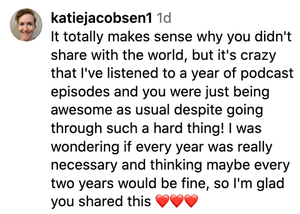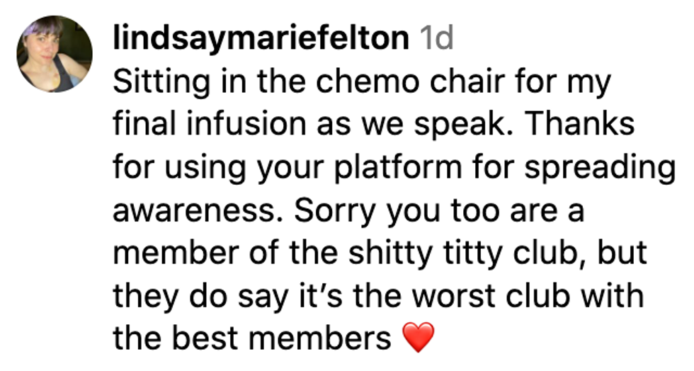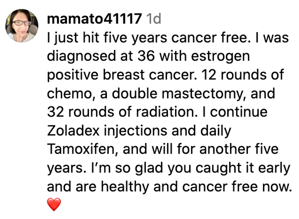 “Seeing women post photos of their mammogram appointments on Instagram needled me into setting my own (which I was late for). I’m so glad I did...Consider this your kick in the butt to get it done…. Suddenly everything in your life is geared around one thing: fighting cancer.”