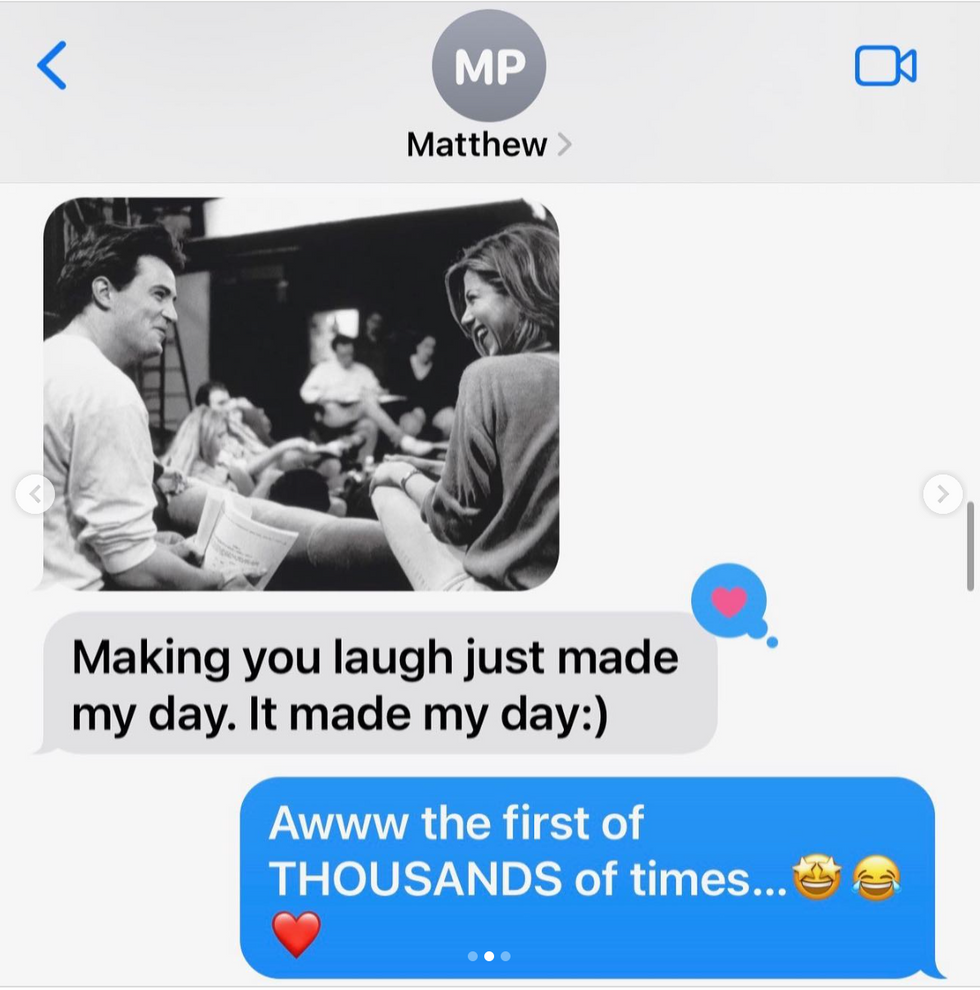 The text from Perry included a throwback photo of the duo engrossed in scripts and sharing a laugh, where he wrote, "Making you laugh made my day," adding, "It made my day :)."