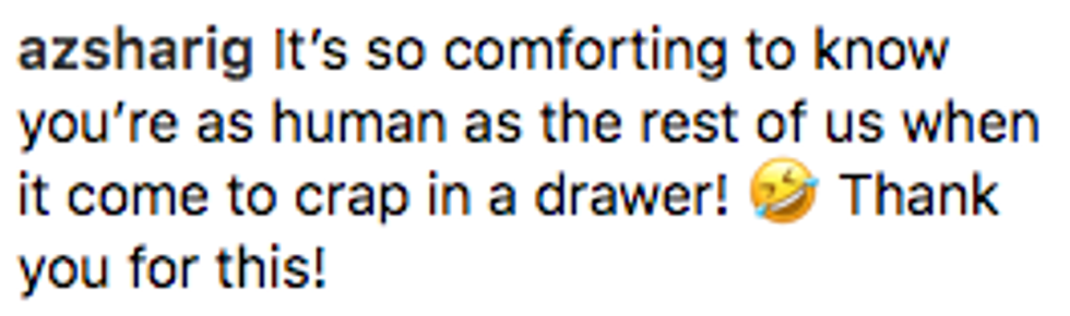 "It's so comforting to know you're as human as the rest of us when it come to crap in a drawer!" writes user azsharig. "Thank you for this!"