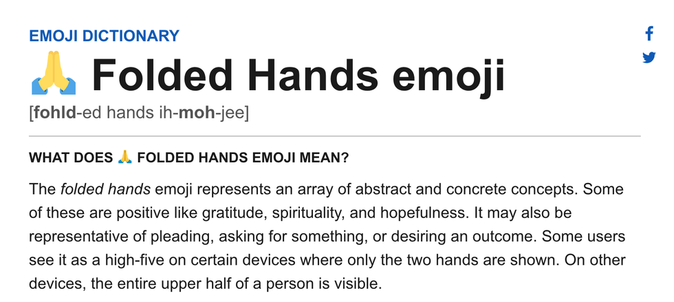 Dictionary.com, addressed the confusion, arguing the folded hands emoji "represents an array of abstract and concrete concepts," and added some of these were positive, like "gratitude, spirituality, and hopefulness."