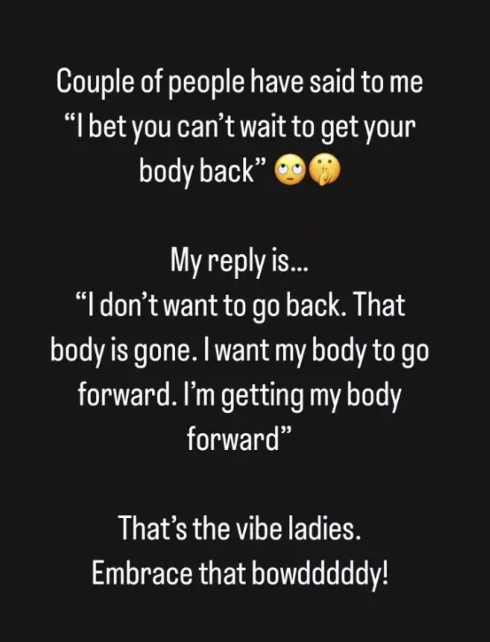 “Couple of people have said to me, ‘I bet you can’t wait to get your body back.'"