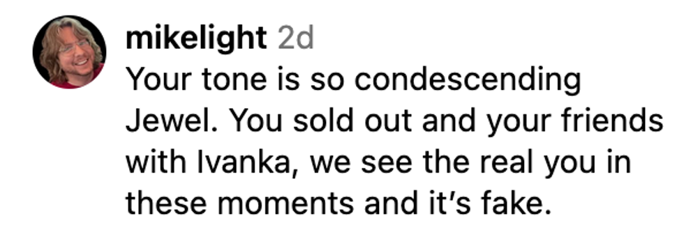 On Friday, Jewel took to Instagram and said, “I am so sorry that some of my longtime fans feel that I let them down."