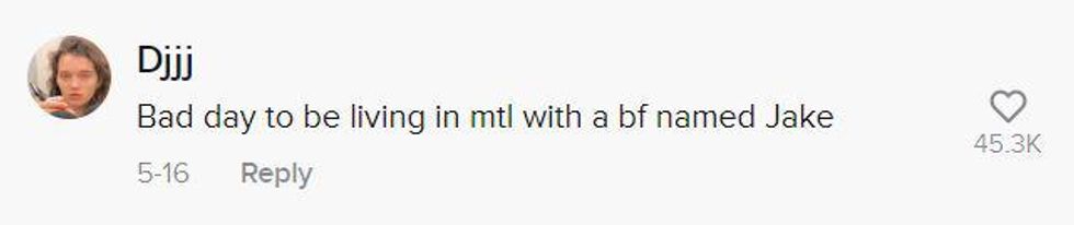 "If your boyfriend's name is Jake and he lives in [Montreal]. He just bought two rings for 'his girl and his side piece'."