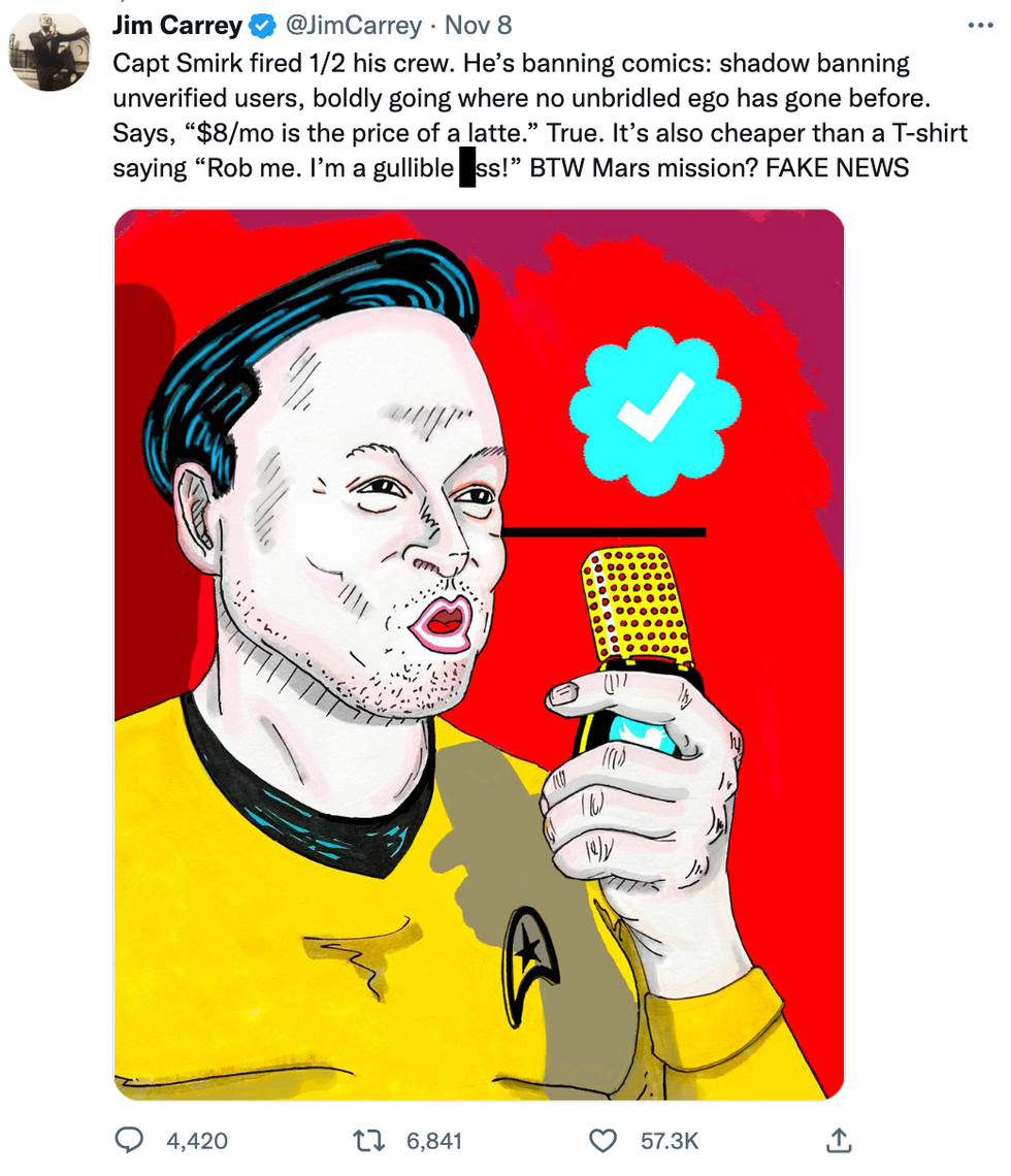 I can't blame Carrey. I was going to leave, then decided I had a little more fight left in me. Decent, thoughtful users are steadily losing ground to belligerent bigots and liars. Fitton, D'Souza, Cruz, and Lake are more active than ever. Eventually, it will become intolerable.