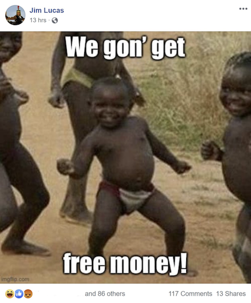 Most likely in response to the money people are receiving in various Democrat-backed stimulus packages, Lucas took to Facebook to post a meme of Black children (the children pictured are unidentified Africans) dancing with the caption: