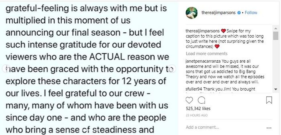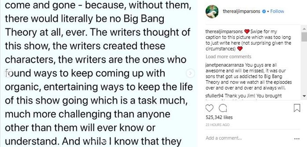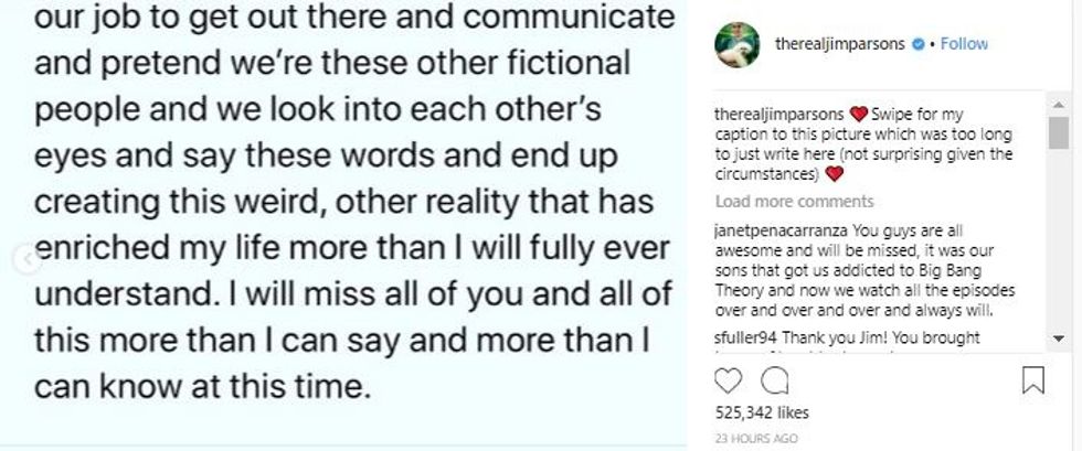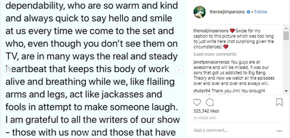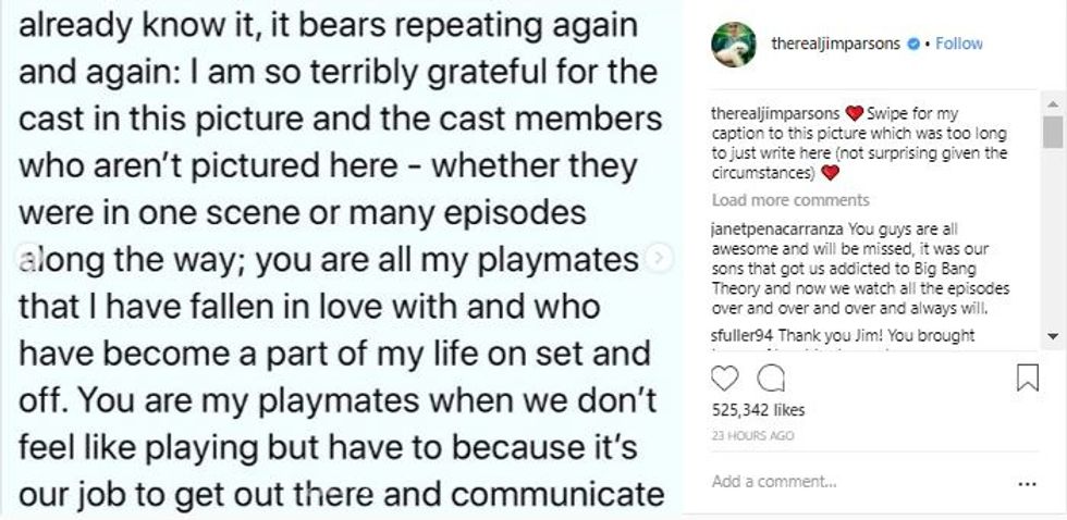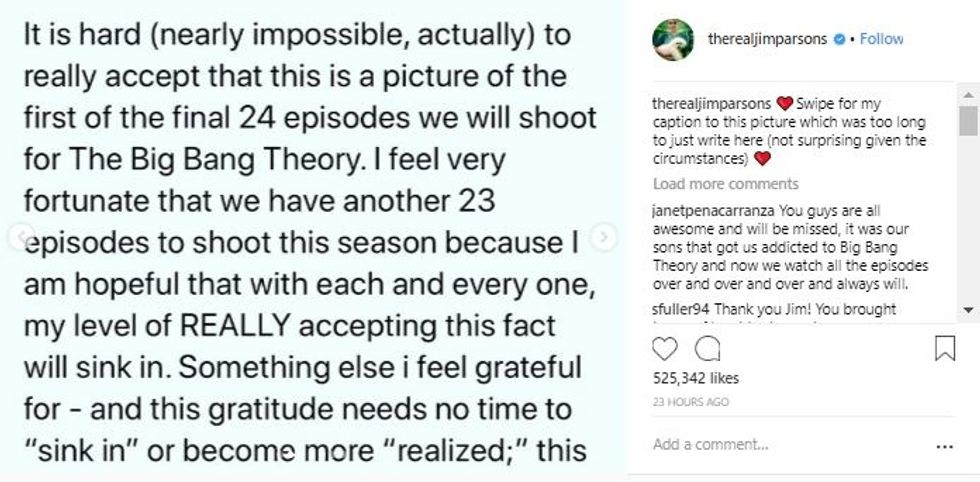 In an emotional letter on Instagram the actor seems to be preapring himself to say good-bye. The note was posted with a photo with co-stars, Johnny Galecki, Kaley Cuoco, Simon Helberg, Kunal Nayyar, Mayim Bialik and Melissa Rauch. The letter read:
