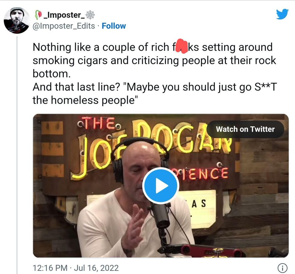 \u201cSickening. Joe Rogan, who\u2019s worth millions, pontificates on the plight of homeless people, then decides the best solution may be just to \u201cshoot the homeless people\u201d.\u201d— Mike Sington (@Mike Sington) 1658246333