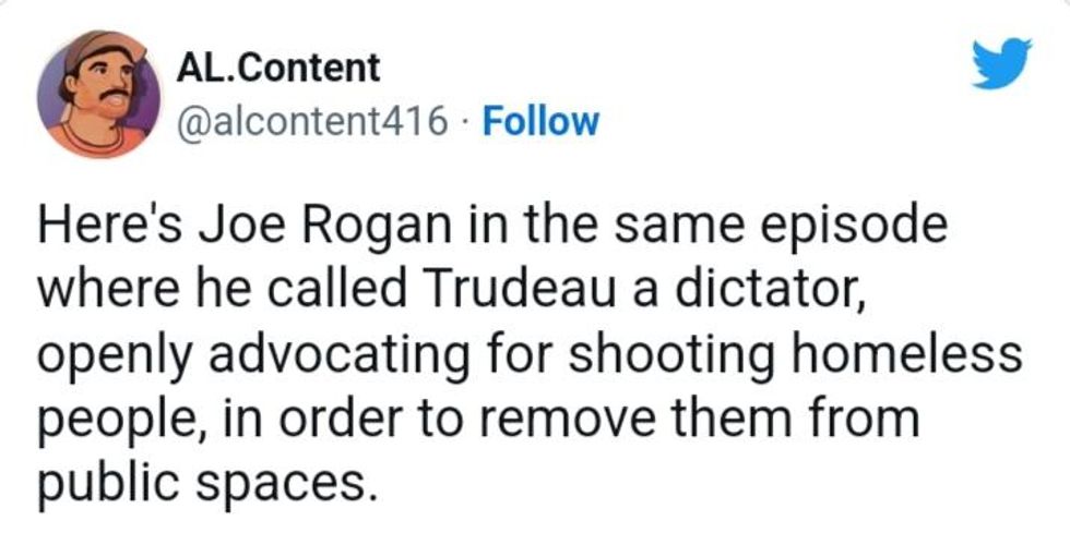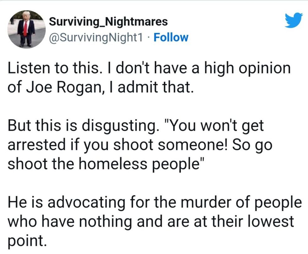 Rogan was obviously riffing, but "shoot the homeless" from a guy whose podcast guest list is a who's who of alt-right, White nationalist extremists?