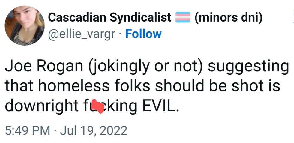 \u201cAnd here's a hateful person applauding Joe Rogan's "shoot homeless people" joke right after praising a "pro-life" advocate. What a fundamentally broken ideology.\u201d— Blair Hodges\ud83c\udf99\ud83d\udd25 (@Blair Hodges\ud83c\udf99\ud83d\udd25) 1658258576