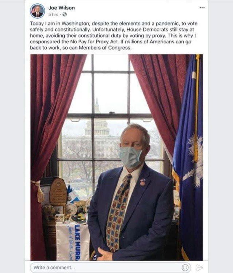 "Today I am in Washington, despite the elements and a pandemic, to vote safely and constitutionally. Unfortunately, House Democrats still stay at home, avoiding their constitutional duty by voting by proxy. This is why I cosponsored the No Pay for Proxy Act. If millions of Americans can go back to work, so can Members of Congress."