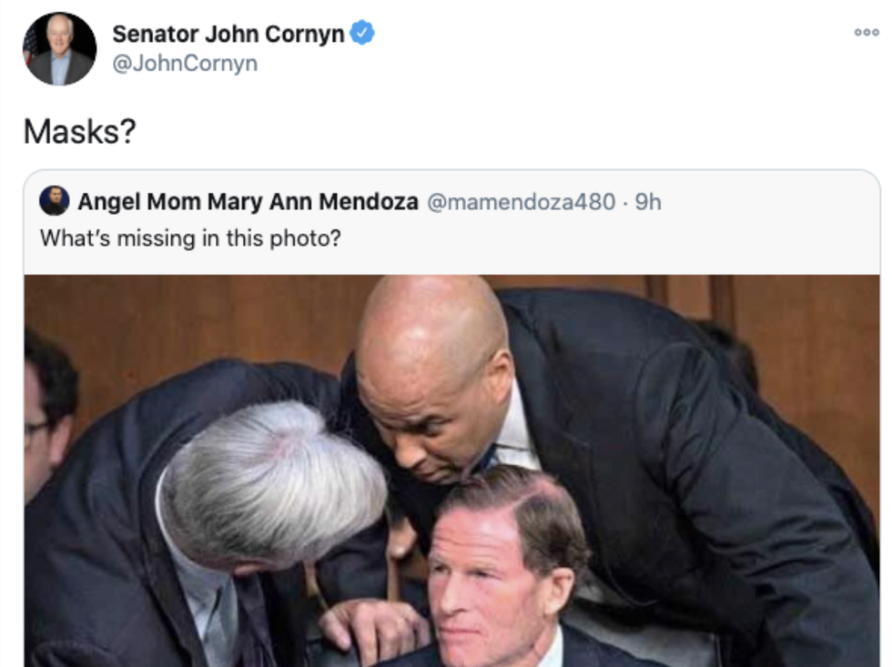 Cornyn just retweeted a picture of Democratic Sens. Sheldon Whitehouse (R.I.), Richard Blumenthal (Conn.) and Cory Booker (N.J.) not wearing masks in 2018