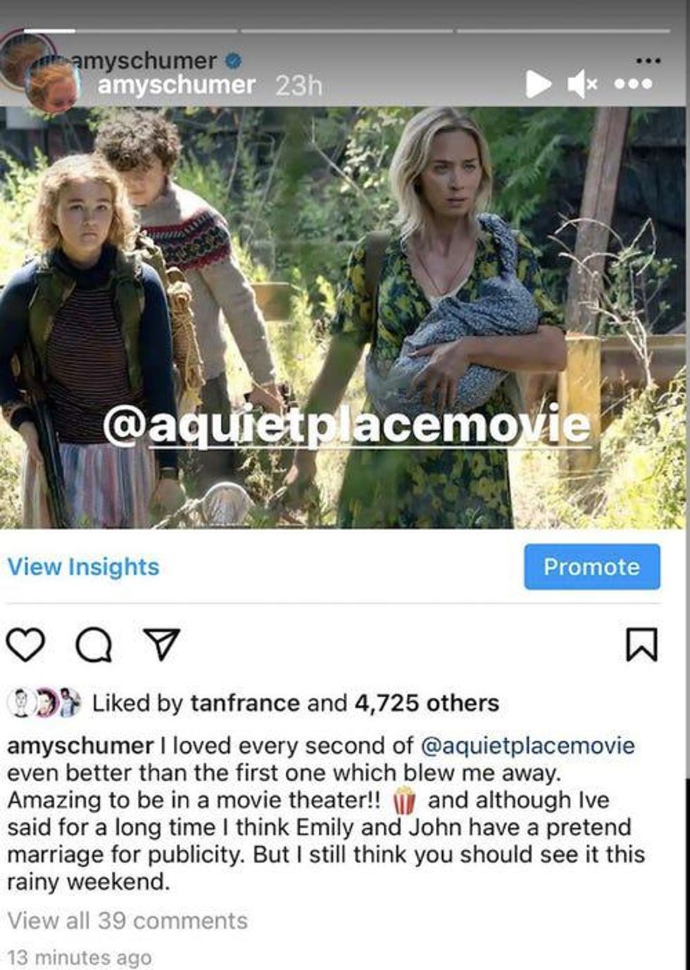 After seeing A Quiet Place II over the long weekend—which has set a pandemic record by grossing $58.5 million over the holiday weekend—Schumer made an Instagram story praising the movie.