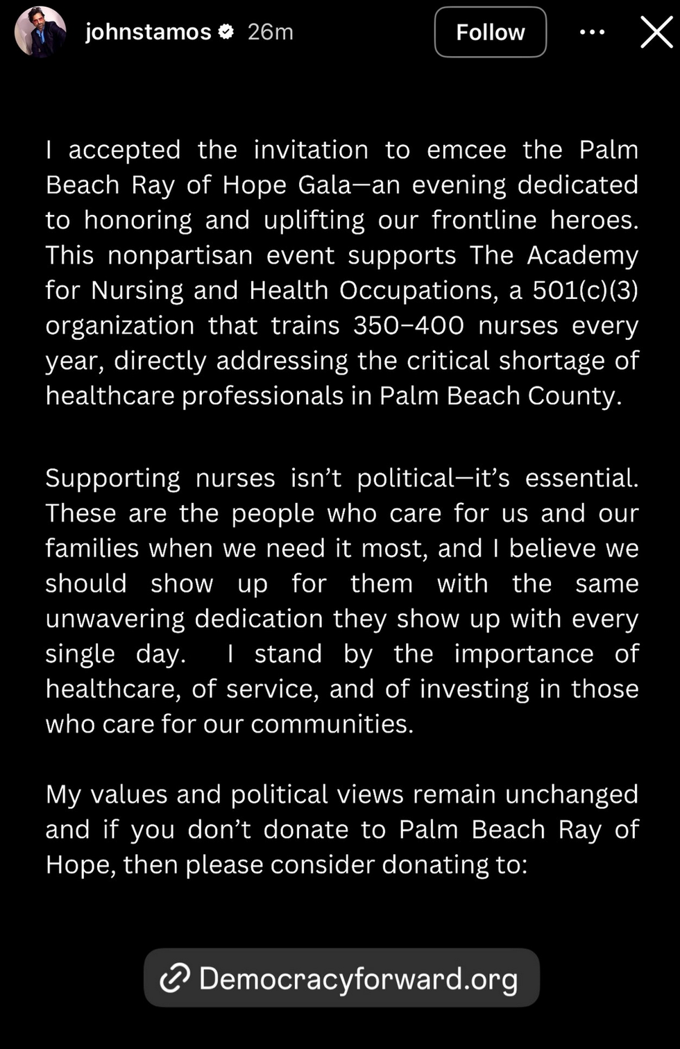 "I stand by the importance of healthcare, of service, and of investing in those who care for our communities. My values and political views remain unchanged," Stamos said.