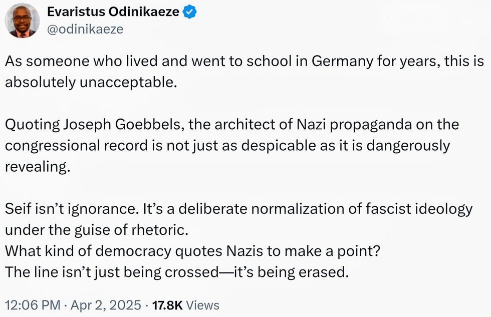 It was after this that Texas MAGA Representative Self decided quoting the head of the Nazi propaganda machine, a quote in support of government disinformation, was the best response.