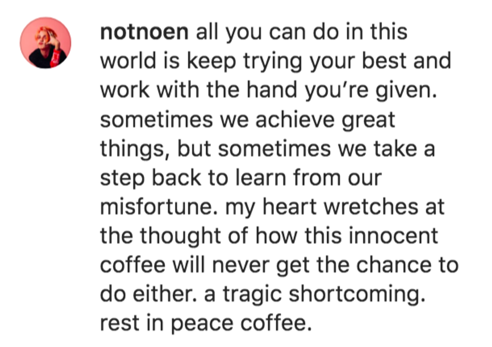 “The internet has been very interested in this photo of me dropping my coffee. But we're all forgetting the real tragedy here," he wrote. “We're forgetting to mourn this coffee. I didn't know it long but damn was our time together special. As fleeting as it was. I'll never forget you."