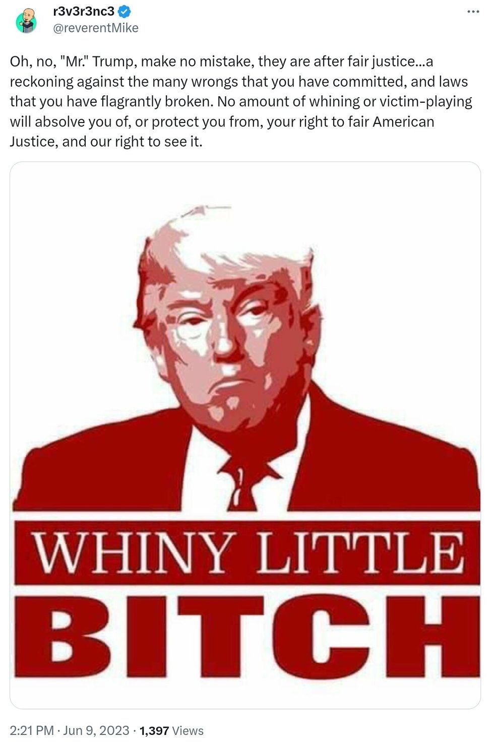 \u201c@DonaldJTrumpJr No, Trump broke the laws of the nation not me!\u201d— Donald Trump Jr. (@Donald Trump Jr.) 1686315660