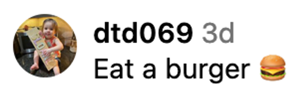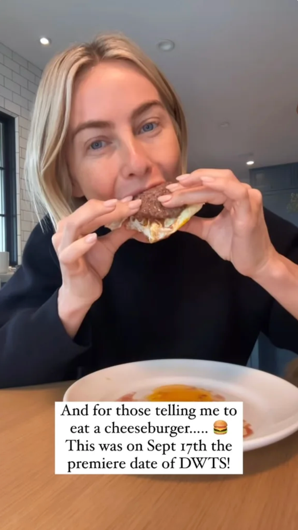 Hough addressed the suggestion she eat higher calorie foods by posting on her Instagram story a photo of her eating a cheeseburger.