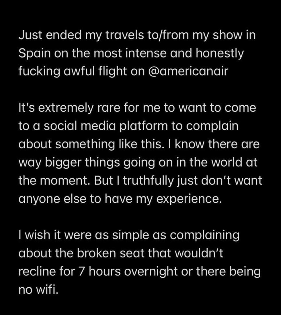 "Just ended my travels to/from my show in Spain on the most intense and honestly f*cking awful flight on @americanair."