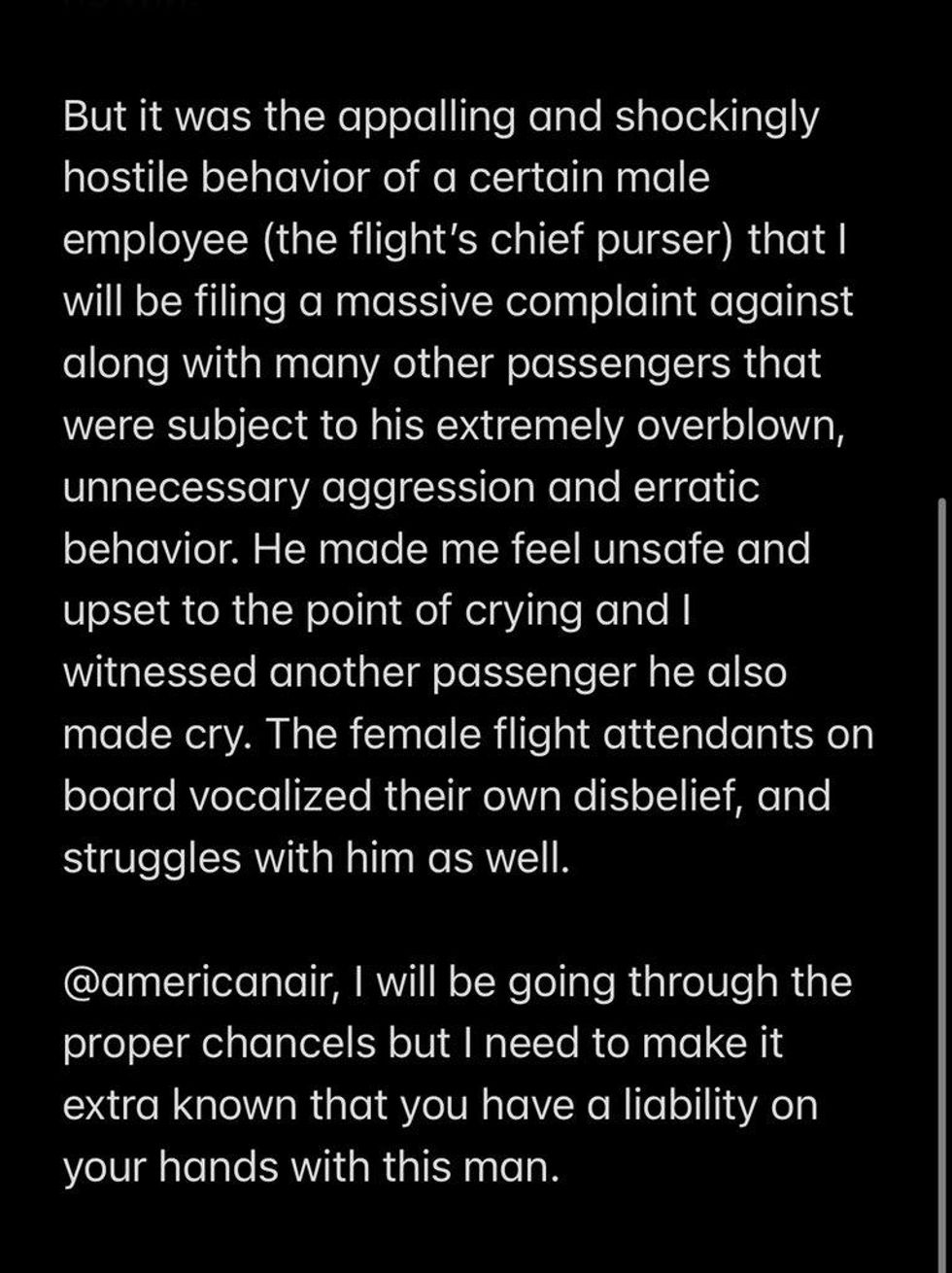 "[I]t was the appalling and shockingly hostile behavior of a certain male employee (the flight’s chief purser) that I will be filing a massive complaint against along with many other passengers that were subject to his extremely overblown, unnecessary aggression and erratic behavior."