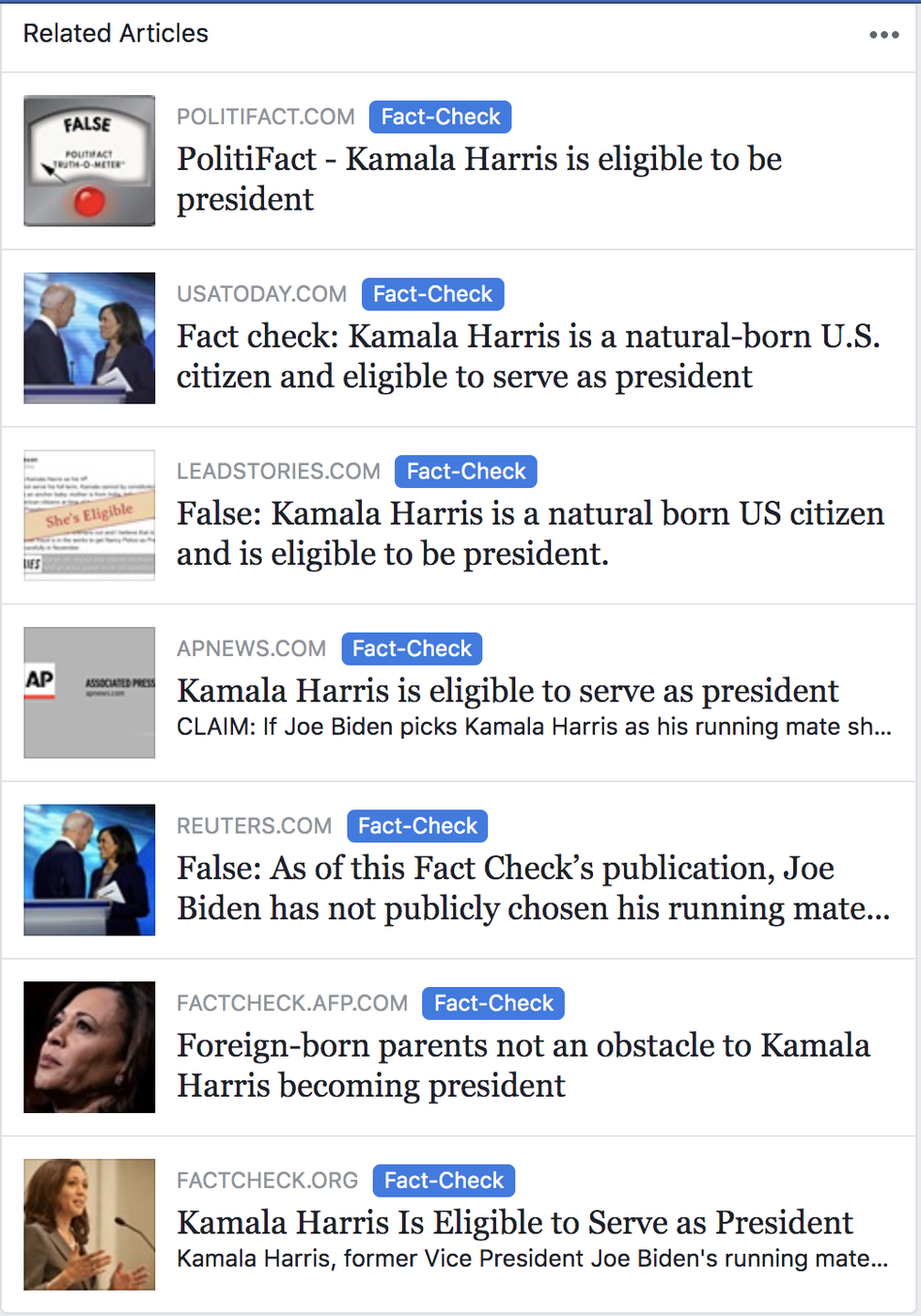 Facebook accompanied the false posts with multiple articles fact checking the blatant falsehood.
