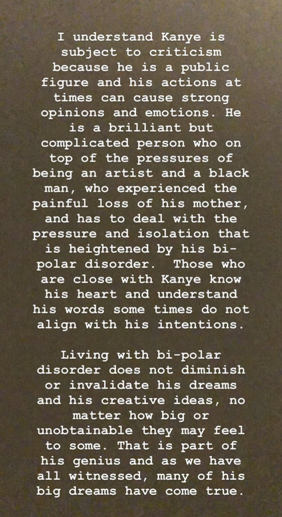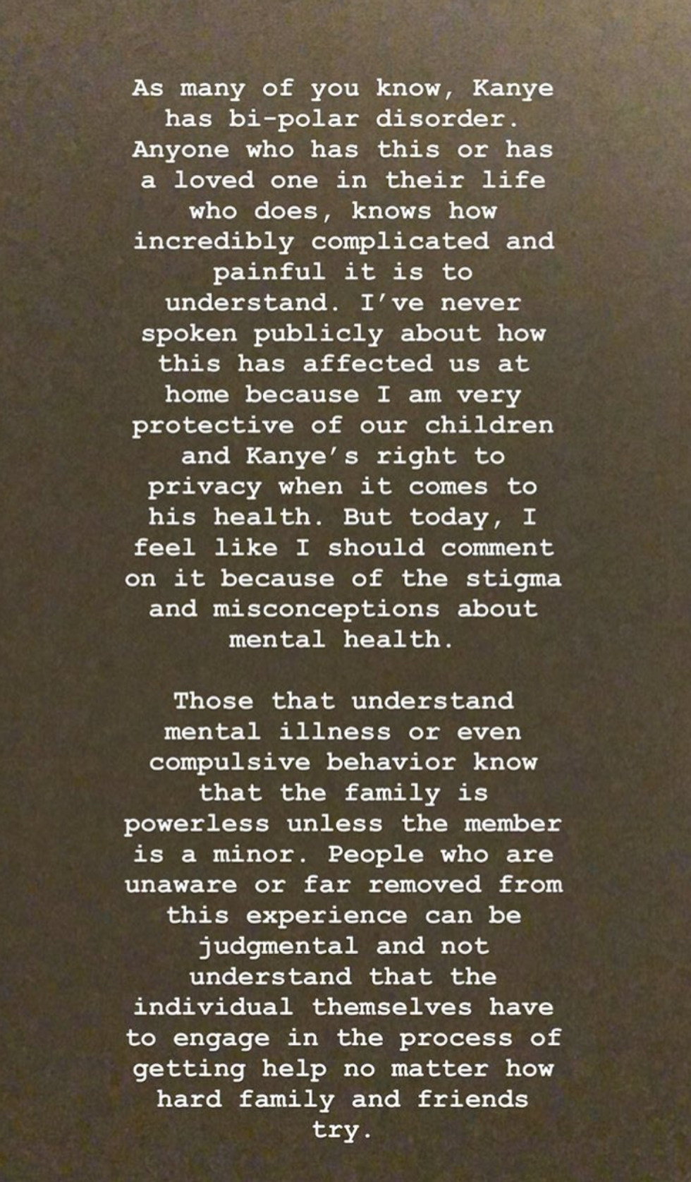 "As many of you know, Kanye has bi-polar disorder. Anyone who has this or has a loved one in their life who does, knows how incredibly complicated and painful it is to understand."