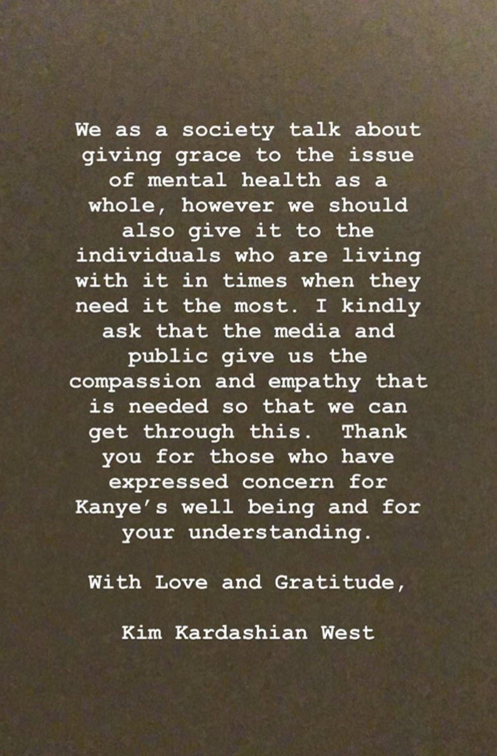 "I kindly ask that the media and public give us the compassion and empathy that is needed so that we can get through this. Thank you for those who have expressed concern for Kanye's well being and for your understanding."