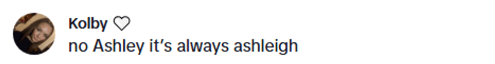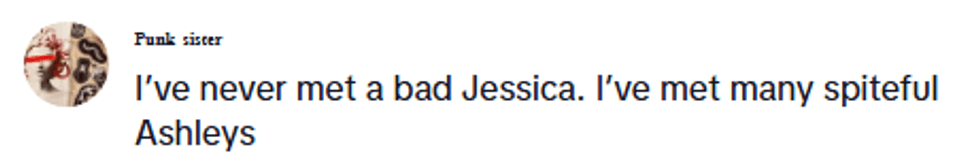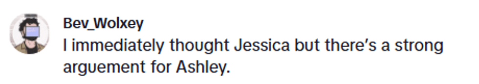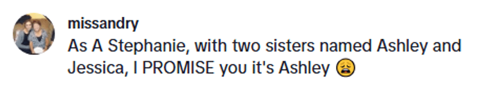 Though TikToker @junkmotherjess said she had seen many comments on another video suggesting Jessica, her comments section resoundingly said "Ashley."