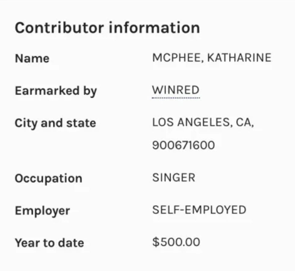 Further Internet sleuthing confirmed a self-employed singer from Los Angeles named "Katharaine McPhee" made donations to anti-gay Republican causes long before the current election.