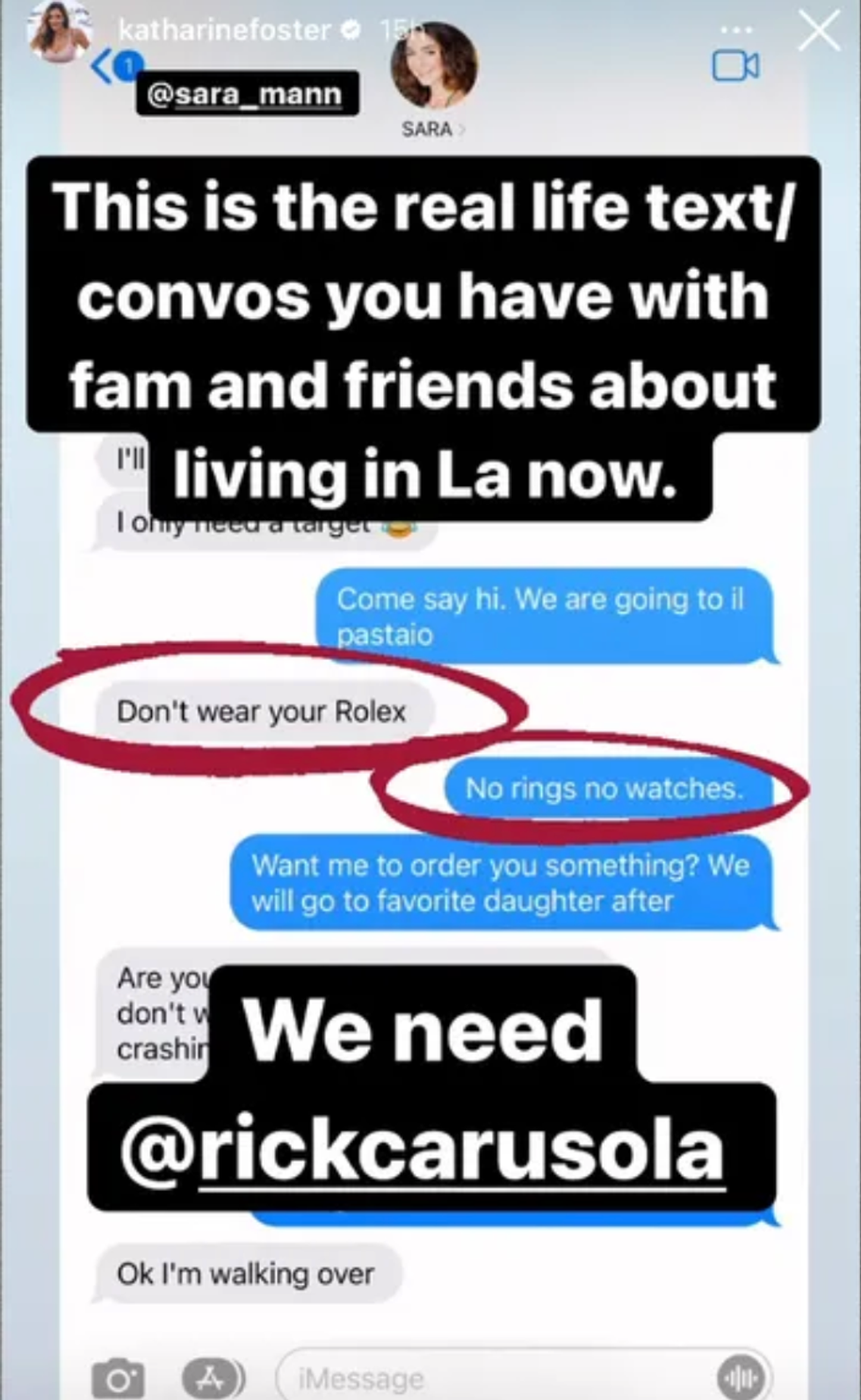 "This is the real life text/convos you have with fam and friends about living in La now. We need @rickcarusola," she wrote.