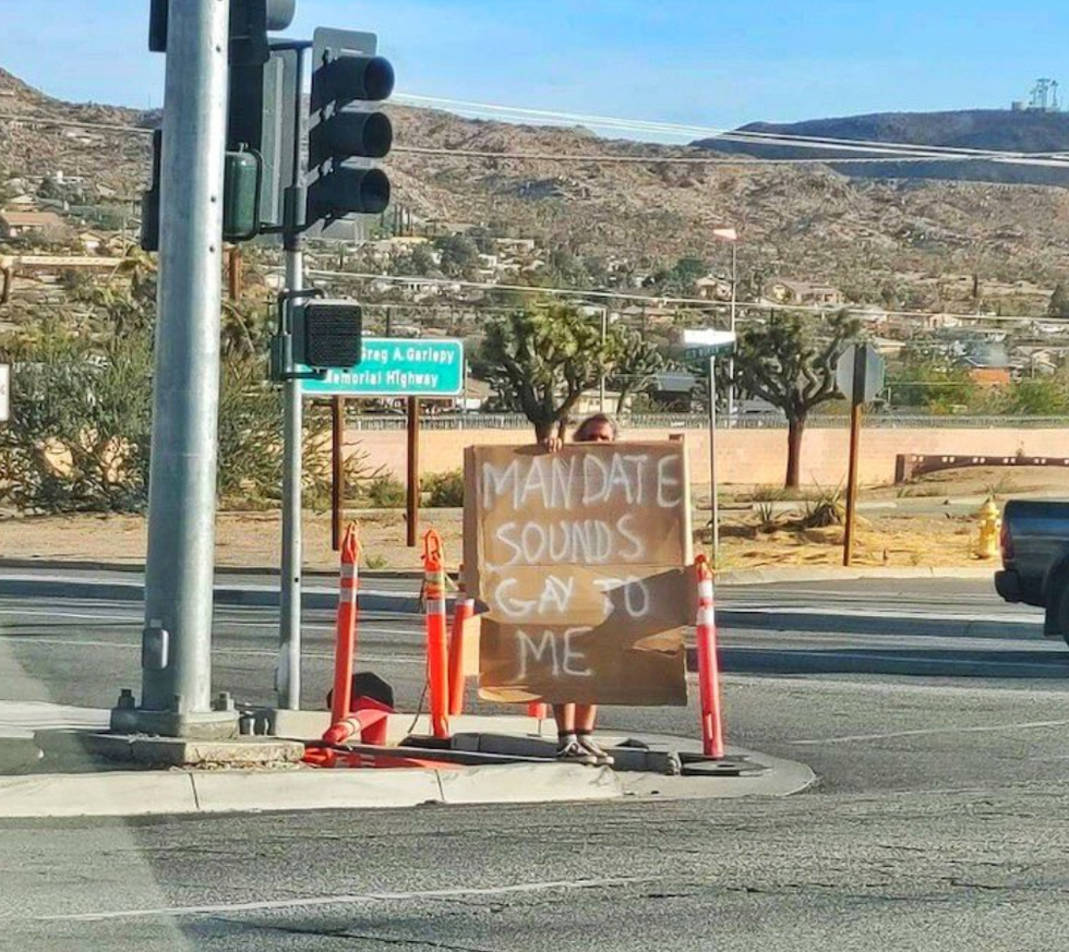 PatriotTakes, an organization that monitors right-wing rhetoric on Twitter, shared a photo of a person holding up a cardboard sign with the words, "MANDATE SOUNDS GAY TO ME."