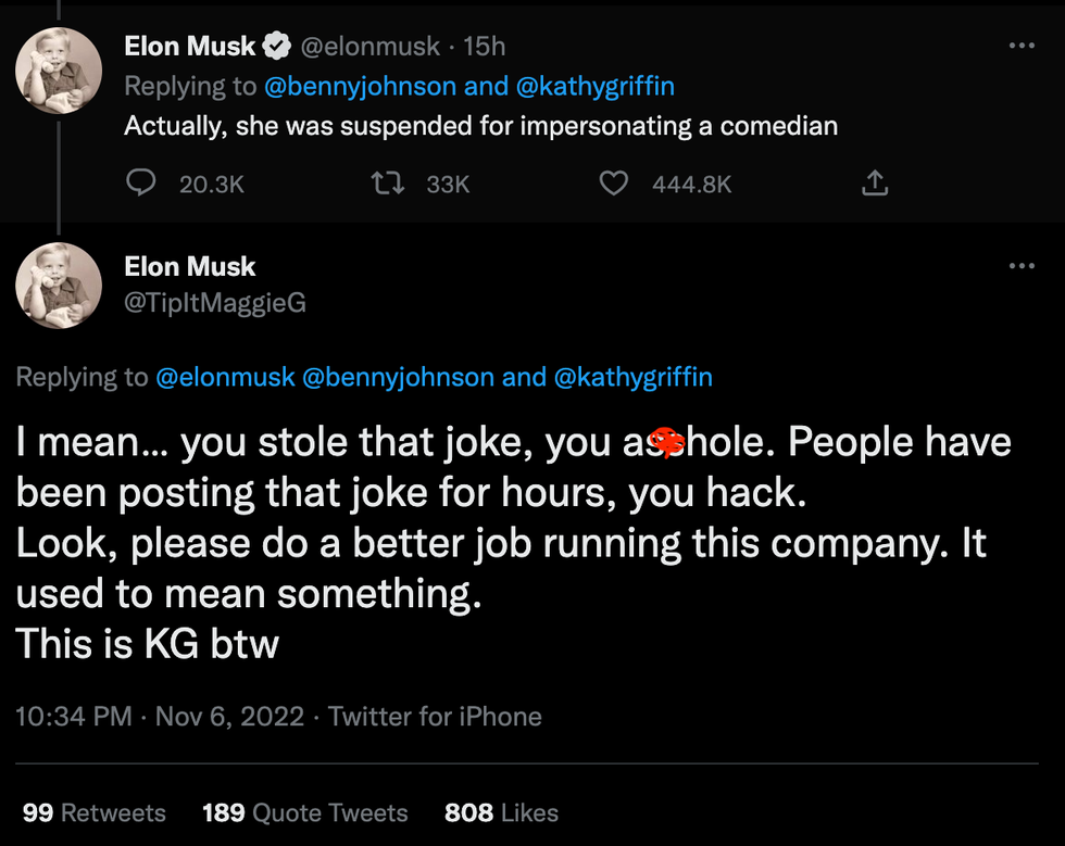 Musk later hit back at Griffin directly, saying that her account was suspended because she had been "impersonating a comedian." Griffin, however, took him to task for the comment immediately, calling him a "hack" and demanding that he "please do a better job running this company."