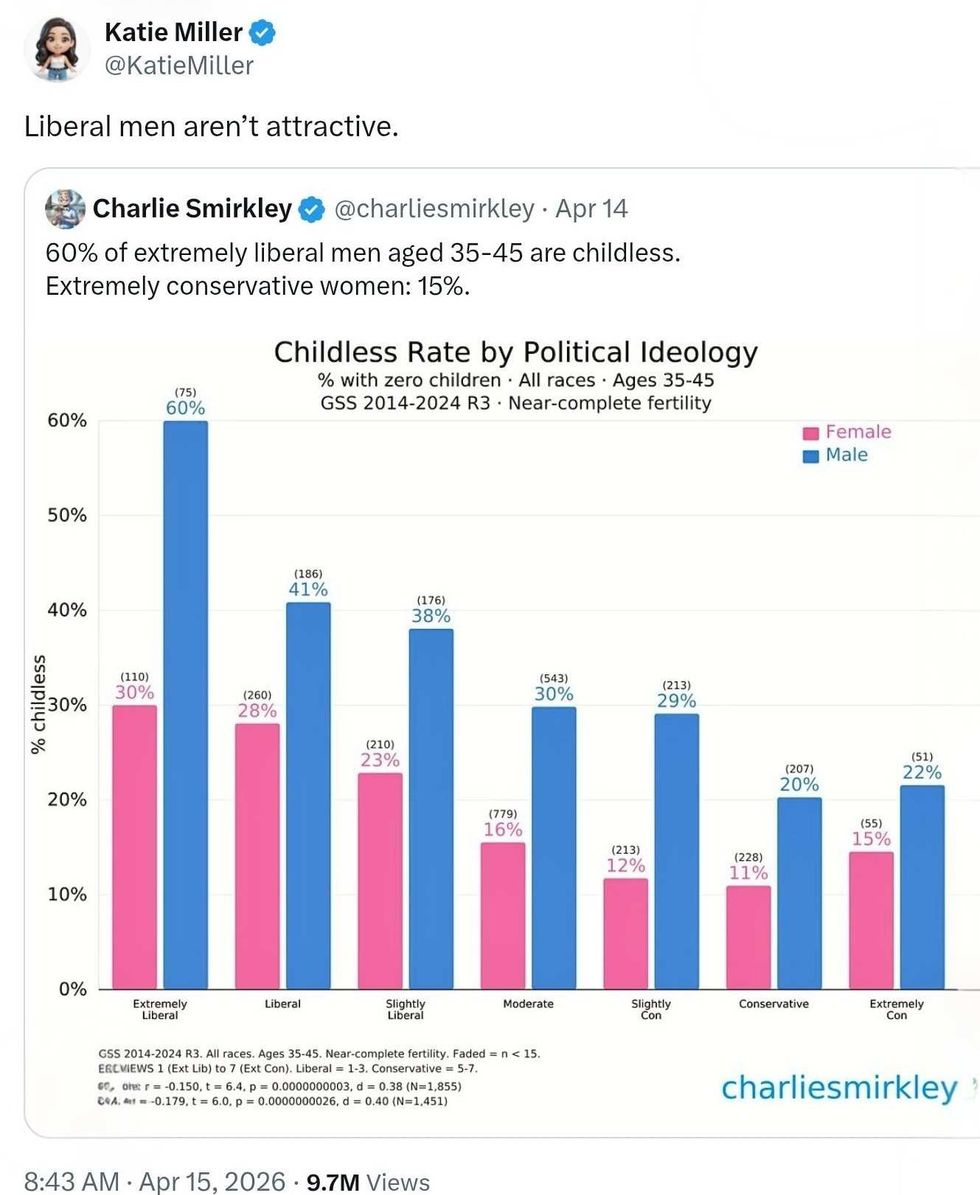 On a repost of the graph "Charlie Smirkley" titled "Childless Rate by Political Ideology," Katie Miller quipped: