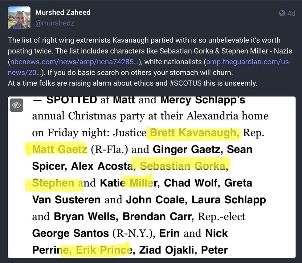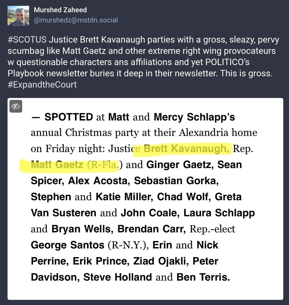 \u201cBRETT KAVANAUGH, who managed to slither his way onto the bench, went to the home of mega-fascist Matt Schlapp last Friday night and had cocktails with Supremacists Matt Gaetz and Stephen Miller. He's the last word? \nWe don't pay taxes to be spit on.\nEnough of this farce.\u201d— Brown Eyed Susan (@Brown Eyed Susan) 1670956765