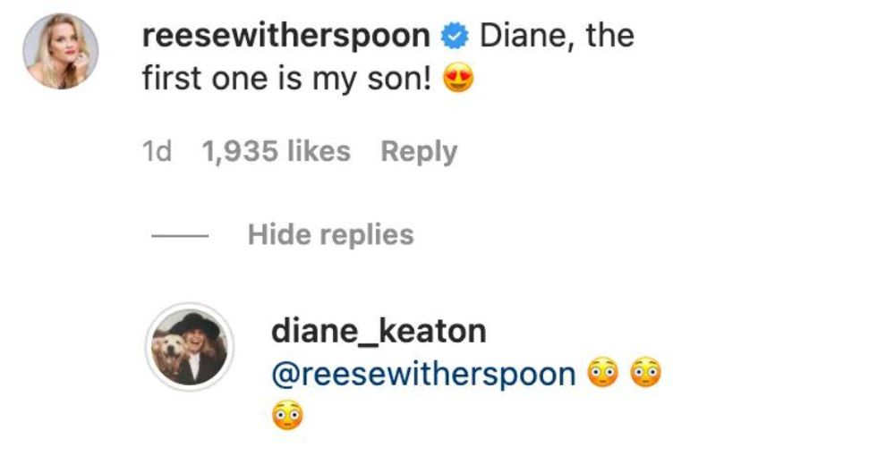 Actress Diane Keaton, known for her peculiar personality and iconic fashion, made an Instagram post about "MALE BEAUTY!!!" where she mistook Reese Witherspoon and ex Ryan Phillippe's 18-year-old son for a young Leonardo DiCaprio.